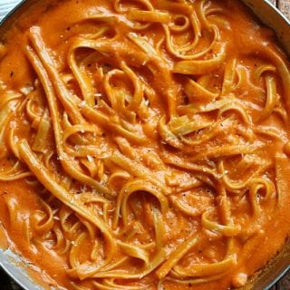 This Roasted Red Pepper Parmesan Fettuccine Pasta is an indulgent creamy sauce with Parmesan, feta, and roasted red peppers.
