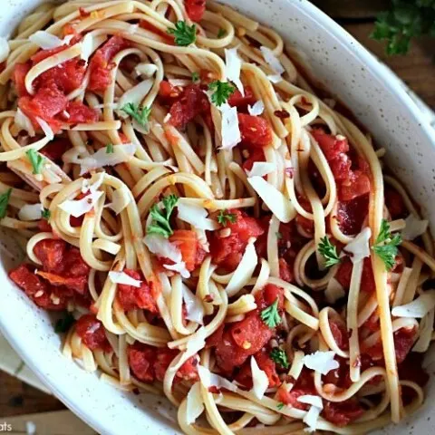 This Arrabbiata, or spicy marinara, combines tomatoes, red chili, garlic, and olive oil for a delicious sauce with a kick.