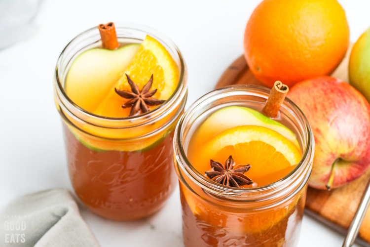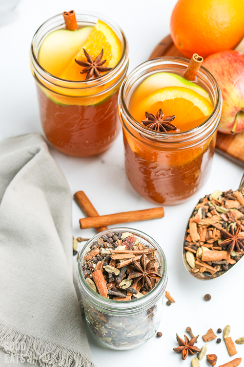 Mulled Cider is one of my favorite fall recipes. I’m not a big fan of Pumpkin Spice Lattes, so this drink is my “fall in a cup” treat. Warm, spicy, and tart with beautiful golden hues- it’s perfect to serve at holiday parties or sip on while passing out candy to trick-or-treaters!