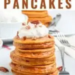 Pumpkin Pancake Recipe made with real pumpkin and seasonal spices. These pumpkin pancakes are perfect for fall with whipped cinnamon butter and maple syrup!