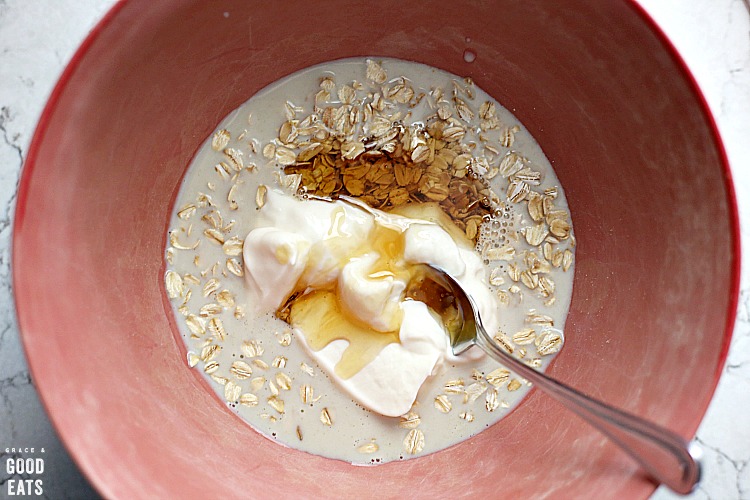 I prefer to use honey as my sweetener, but you could also use maple syrup, agave, date sugar, coconut sugar, brown sugar, or white sugar. A little goes a long way, especially depending on what types of mix-in toppings you choose. You could omit the sweetener and use a splash of vanilla or pinch of cinnamon as well. Mashed banana would also be a great choice!