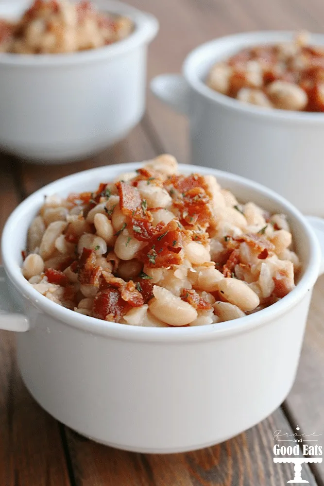 March is in full swing here in Texas, though the weather can’t seem to make up its mind between winter and spring. Our kiddos have been on Spring Break this week and the cooler temps have me wishing I was sitting somewhere sandy, under an umbrella, with another [miniature] one in my drink. Instead I am making up a big batch of these Slow Cooked Bacon and Beans to keep us warm. (Not to be confused with the yummy Bacon Baked Beans I made last week. We’ve been on a winter comfort food kick lately.)