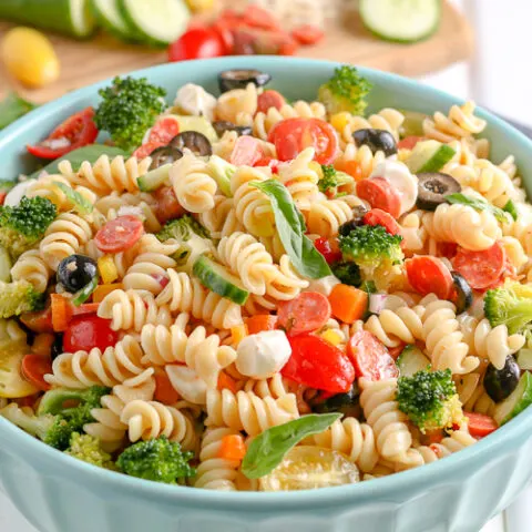 This easy pasta salad recipe is deliciously flavorful as is, but also totally flexible- omit the meat, add in your favorite veggies, or sub in different cheeses to your liking.