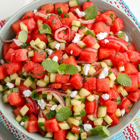 Serve this Watermelon Salad as a side with grilled chicken or spoon over arugula for a quick meal.